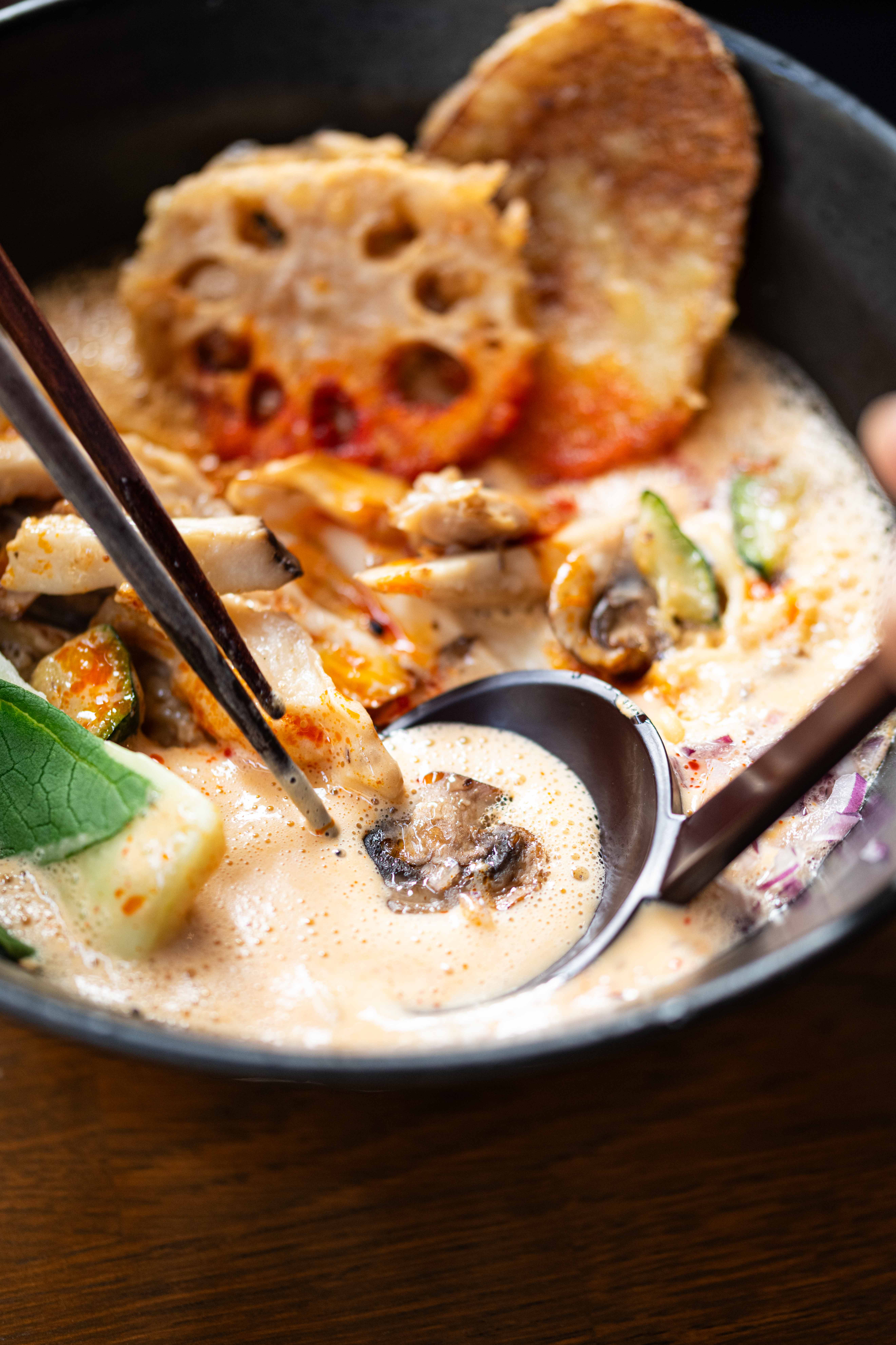 vegetable broth with sesame paste, homemade chili oil, shanghai bok choy, sautéed mushrooms, red onions, fried onions, vegetable tempura.