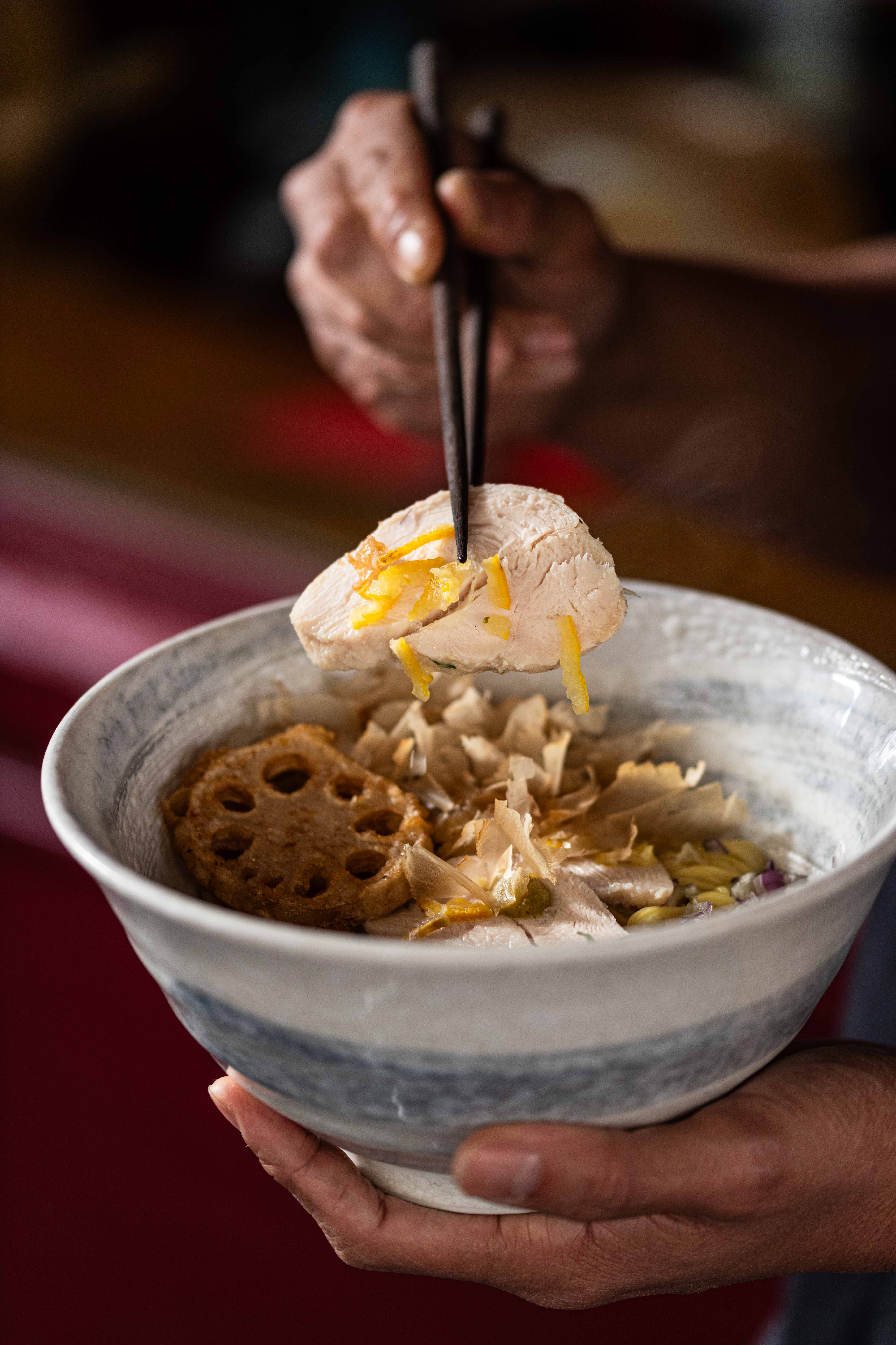 bouillon tchintan, huile parfumée à la bonite, jus de yuzu tempura de renkon, tranches de poulet & canard zeste de yuzu, shiso copeaux de bonite séchée yuzu poivré